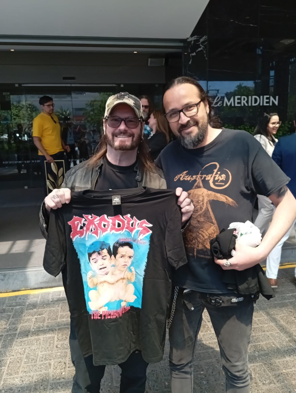 ¡Qué buen sábado, ctm! No encuentro mejor expresión para graficar lo vivido hace tan solo unas pocas horas: tener la posibilidad de entregarle una polera -en representación de este humilde webzine- a Gary Holt, con nuestra versión de la carátula del disco editado hace cuatro décadas, y posteriormente presenciar una verdadera lección de violencia, no tiene precio.