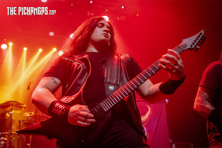 Con el transcurso de las horas, la afluencia de público aumentaba, pavimentando el camino para el segundo número nacional de la noche: TERROR SOCIETY, agrupación que, con doce años de trayectoria, tiene en su vitrina una no despreciable cantidad de lanzamientos. Con un sonido más cercano al de los cabezas de cartel, los formados en 2013 -con el Thrash de tintes Death Metal como consigna— incitaron los primeros mosh en las tablas del recinto de calle San Diego.