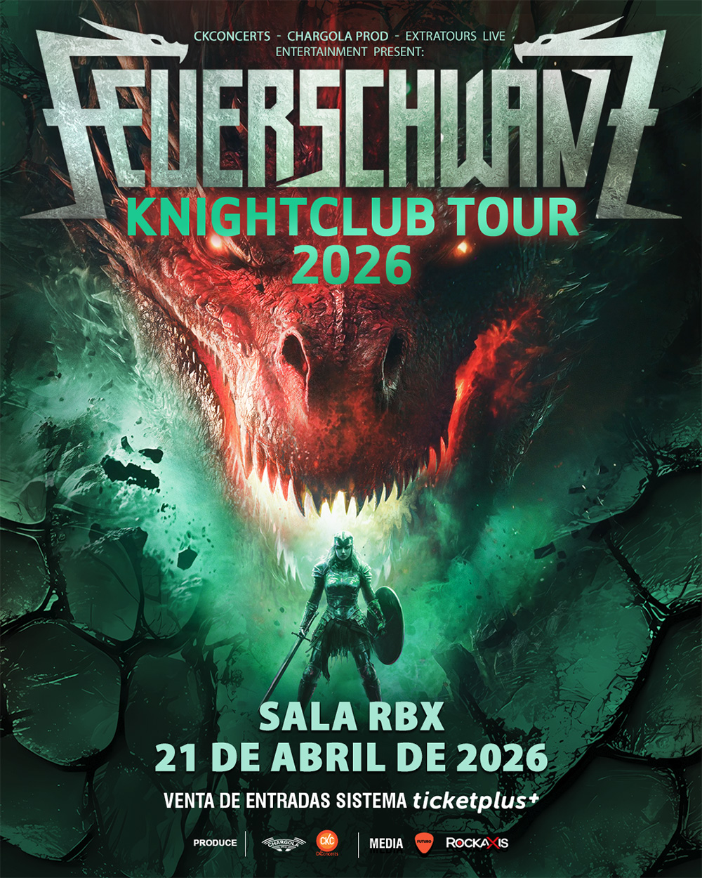 Los alemanes FEUERSCHWANZ (no sabemos como se pronuncia) acaban de confirmar su primer concierto en Chile, el próximo 21 de abril de 2026 en el Sala RBX (reemplazando al Teatro Cariola), como parte de su gira "Knightclub Tour 2026", donde presentarán su más reciente disco lanzado en agosto de este año.
