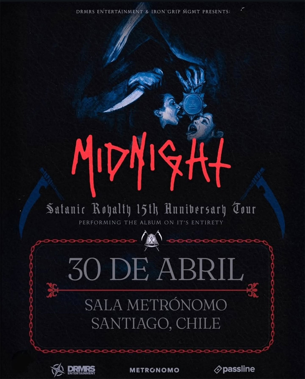 ¡Atención, hordas nocturnas! MIDNIGHT vuelve a Santiago y no lo hace con cualquier excusa: la banda llegará el 30 de abril a Sala Metrónomo para festejar como corresponde los 15 años de "Satanic Royalty", disco clave de su carrera y que interpretarán completo y sin misericordia.